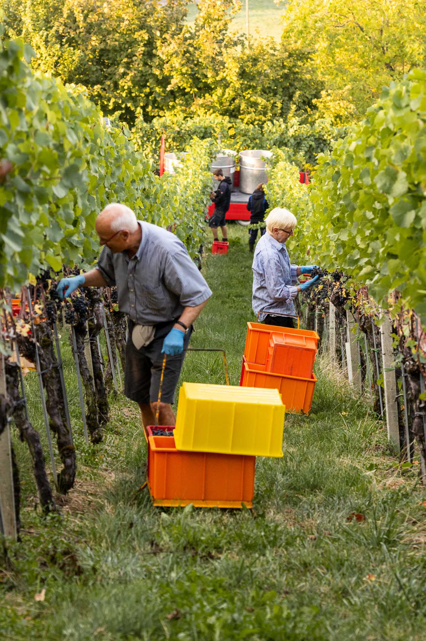Wir können uns nicht erinnern, jemals eine Weinlese so früh angefangen und so schnell wieder beendet zu haben. Seit dem 31. August haben wir an 17 Tagen, mit durchschnittlich 15 Helferinnen und Helfer geherbstet. Wegen den warmen Temperaturen starteten wir früh am Morgen. Dennoch sind einige Schweisstropfen geflossen. Auch im Weinkeller waren wir gefordert, hiess es doch die Trauben in kurzer Zeit sehr sorgfältig und selektiert zu verarbeiten.